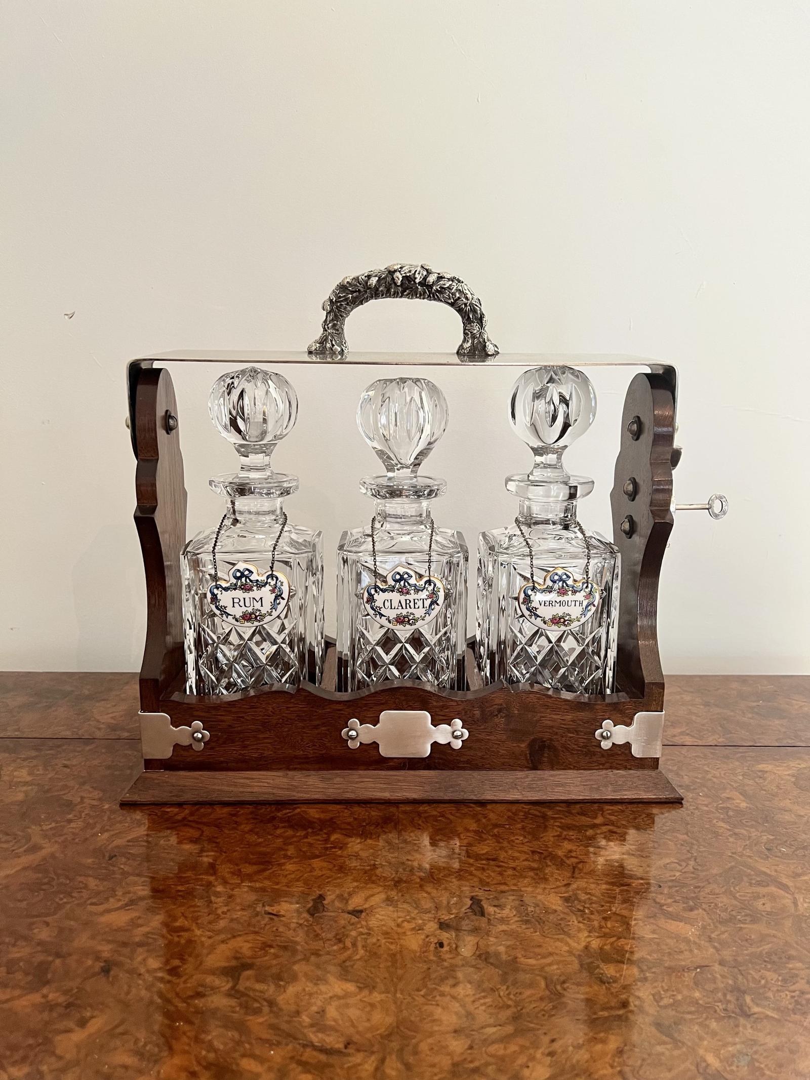 Quality Edwardian antique mahogany tantalus with silver plated mounts having three cut glass decanters with the original stoppers, crown Staffordshire porcelain decanter labels, in a mahogany frame with silver plated mounts and a ornate silver plated carrying handle to the top, with a working lock and key to the side.