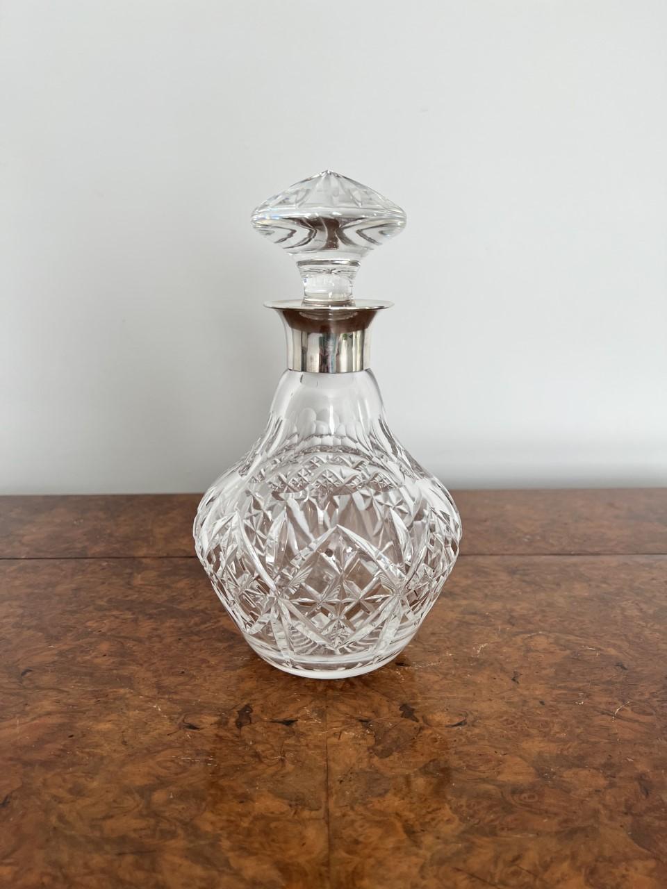 Quality antique Edwardian silver collar shaped decanter having a quality antique Edwardian silver hallmarked collar with a cut glass decanter and the original cut glass stopper.