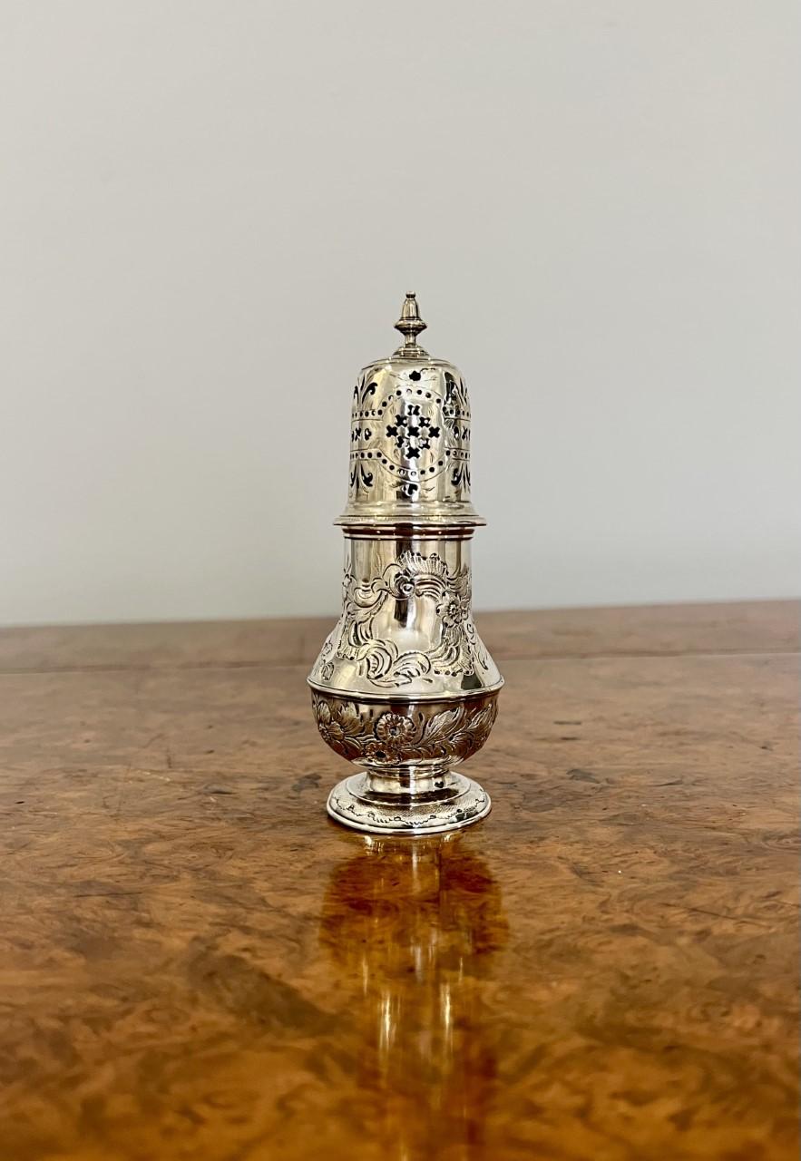 Quality antique George III hallmarked silver sugar sifter having a pierced removable top above a engraved shaped vessel on a circular base.
