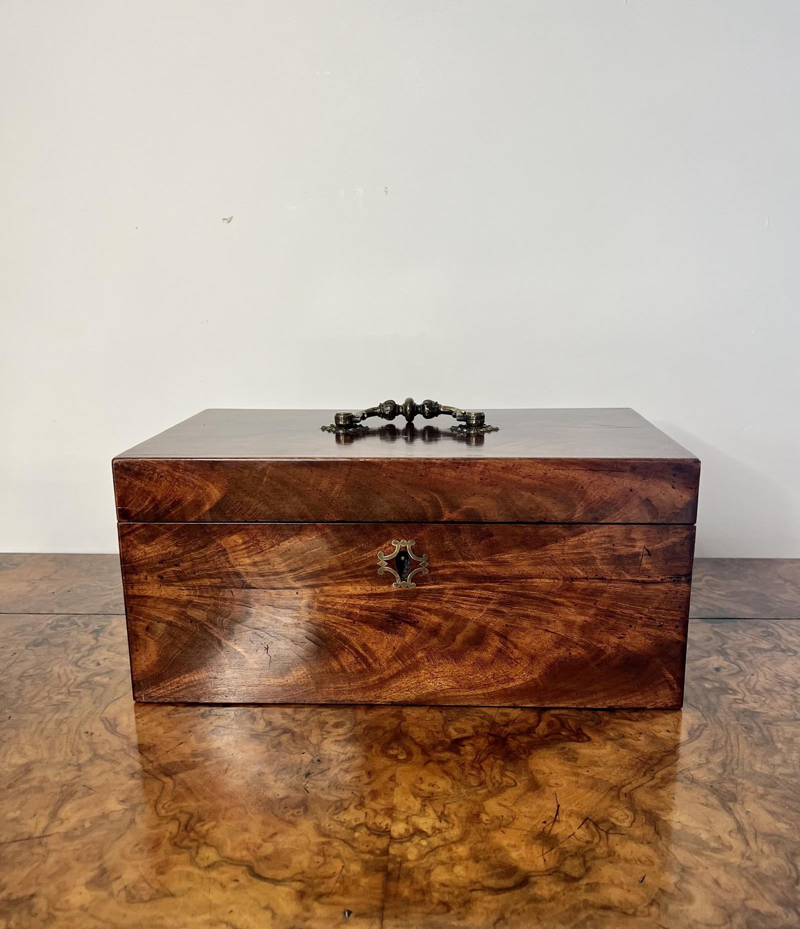 Quality antique George III large tea caddy with the original brass ornate handle to the top opening to reveal three storage compartments.
