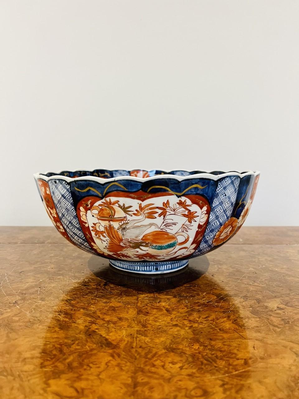 Quality antique Japanese Imari bowl having a scalloped shape edge with wonderful hand painted panels comprising of a vase of flowers and leaves in fantastic red, blue white and gold colours.