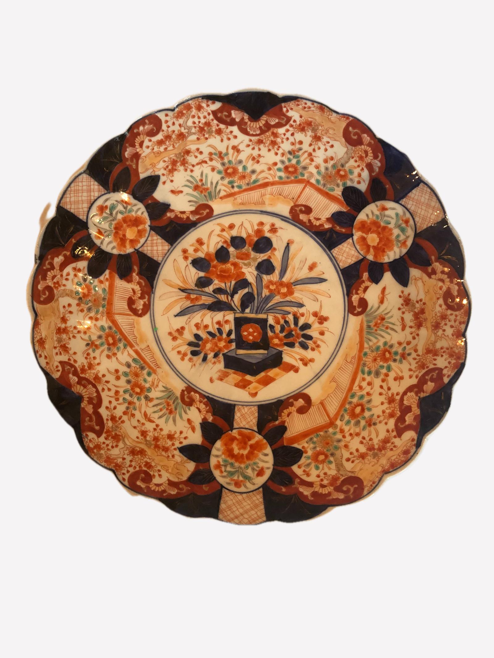 Quality antique Japanese imari plate with a shaped scalloped edge, quality hand painted panels with flowers, leaves, trees & butterflies in wonderful red, blue, green, white & gold colours.