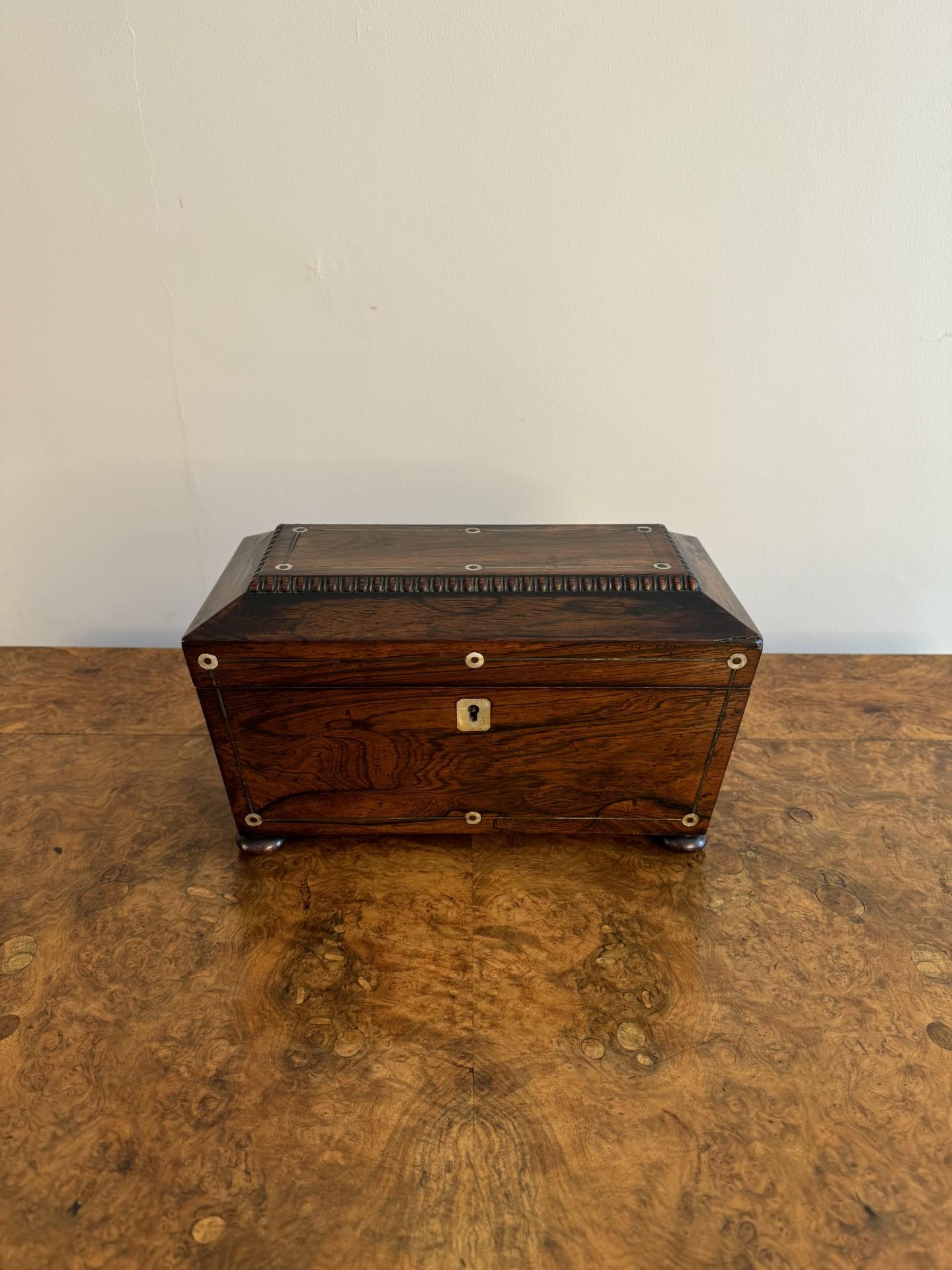 Quality antique Regency rosewood tea caddy with a quality carved moulded edge top opening to reveal a fitted interior with two lidded compartments for tea and a glass mixing bowl to the centre, ring carrying handles to the sides raised on the original bun feet.