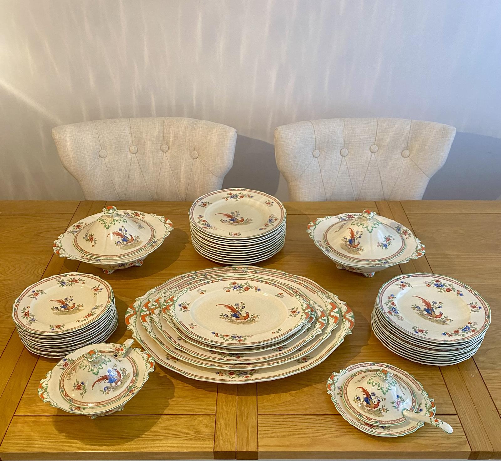 Quality antique Royal Venton Ware dinner service set decorated with lovely Japanese pheasants, consisting of six serving platters, three serving bowls, twelve large plates 26cm, eleven medium plates 23cm and twelve side plates 20cm.