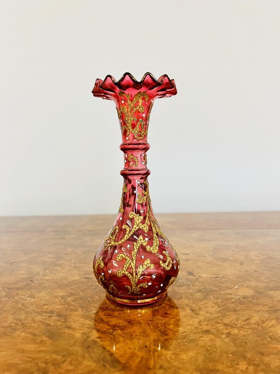Quality antique ruby Bohemian glass vase having a quality shaped ruby coloured glass vase with shaped decoration