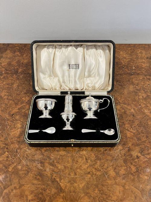 Quality antique solid silver boxed cruet set. Having a quality solid silver pepper pot, mustard pot and a salt pot with the original pair of spoons in the original box.