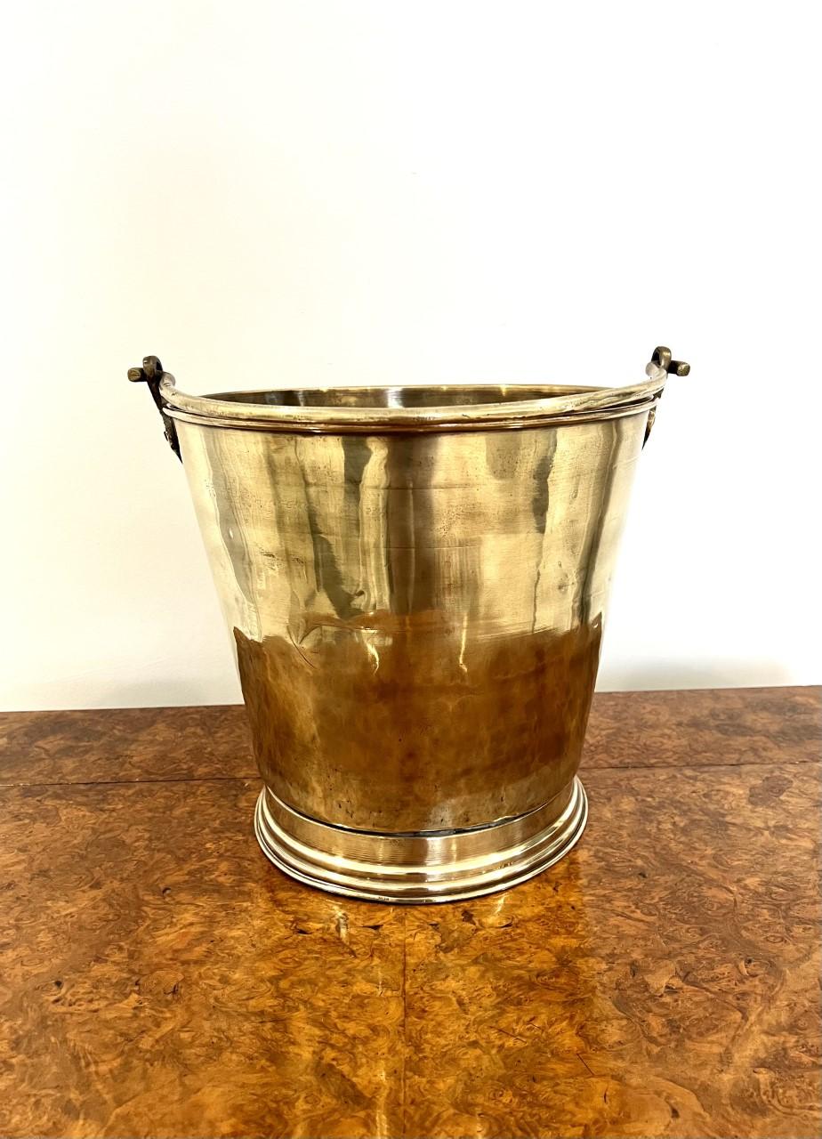 Quality antique Victorian brass coal bucket having a quality antique Victorian brass coal bucket with a swing handle to the top having a circular body standing on a circular base.