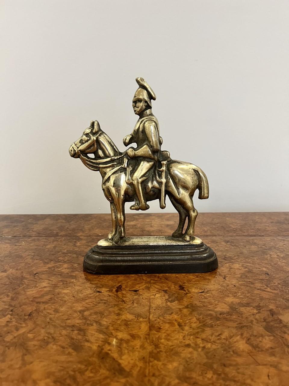 This is a quality late 19th Century Victorian antique brass door stop, having a quality solid brass model of a horse and knight in period clothing standing on a shaped iron base.