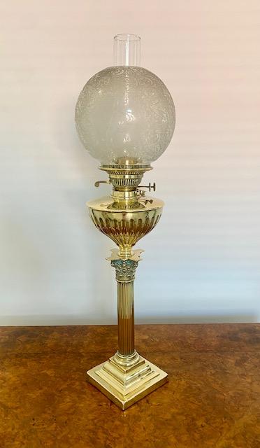 This is a quality mid 19th Century Victorian antqiue brass oil lamp having the original floral decorated glass shade brass reservoir supported on a brass Corinthian column raised on a square stepped brass base