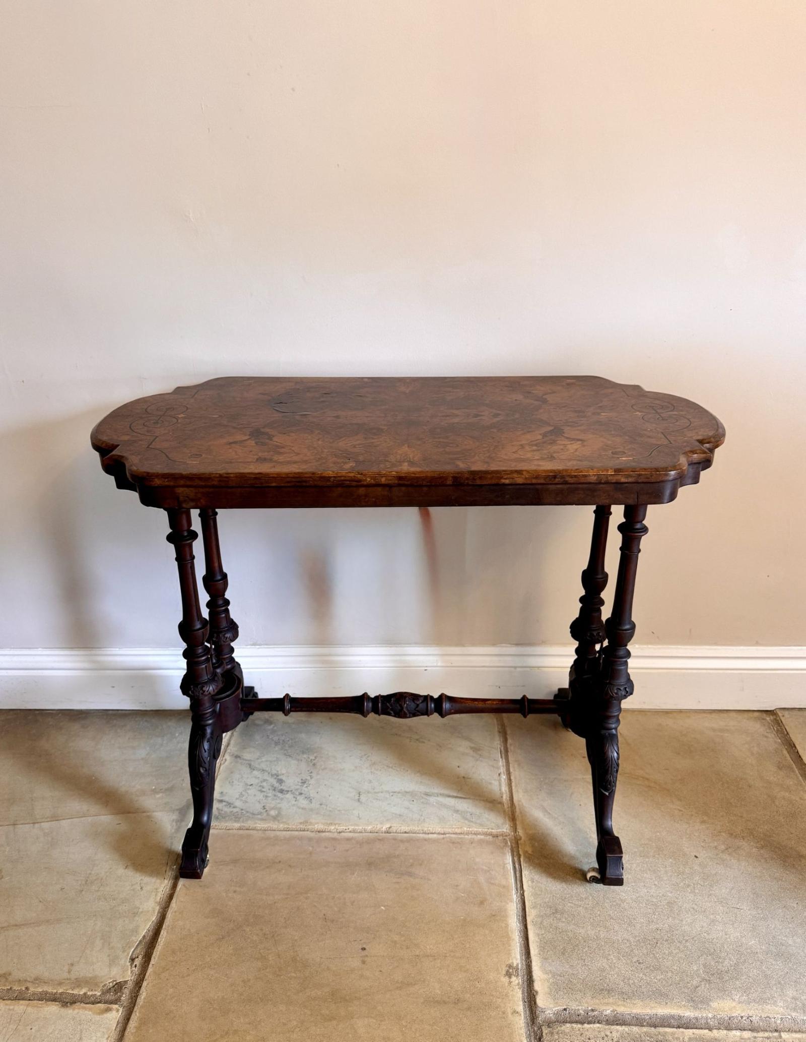 Quality antique Victorian burr walnut occasional table, having a quality antique Victorian occasional table with a burr walnut shaped top with inlaid decoration, on carved frame raised on the original castors.