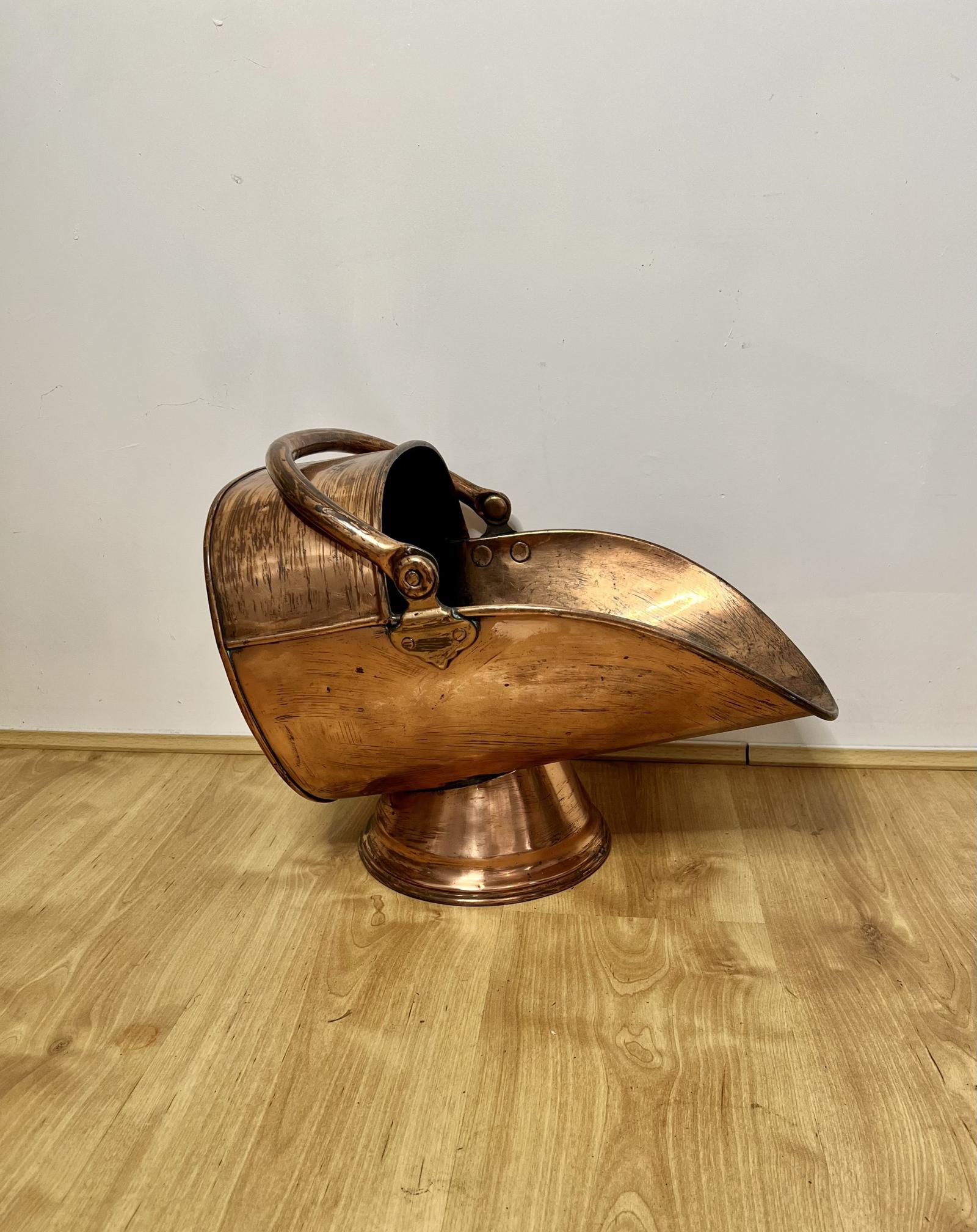 Quality antique Victorian copper coal scuttle having a lovely shaped scuttle raised on a circular base with a carrying handle to the back and a swing handle to the top.