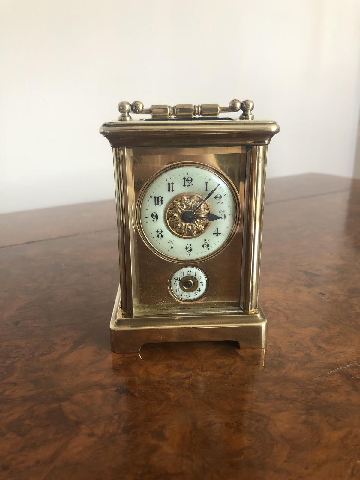 Quality antique Victorian French brass carriage clock, having a quality brass and bevelled edge glass case with an 8 day French movement and a alarm enamel circular dials, ornate centre with original hands and key