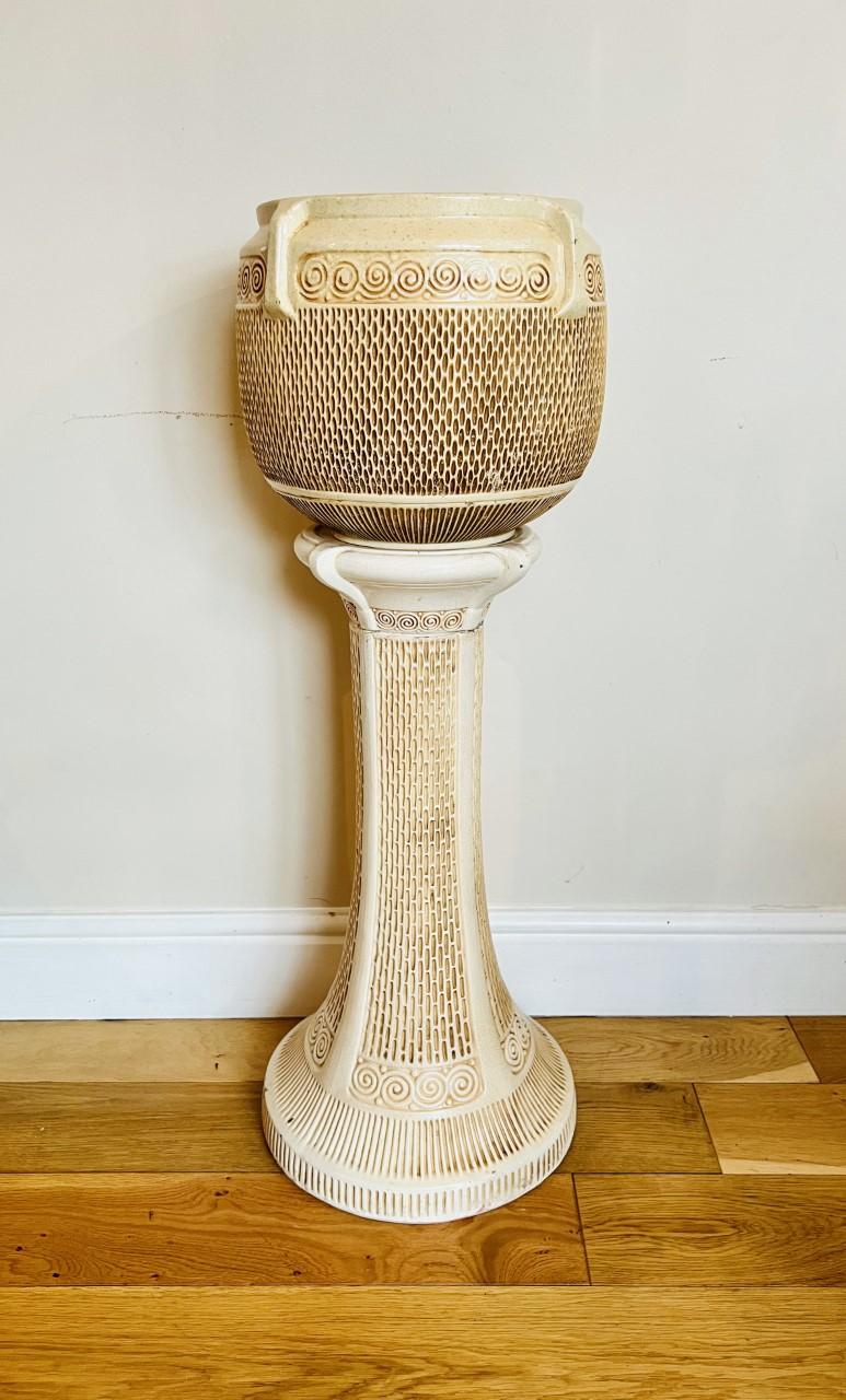 This is a quality late 19th Century Victorian antique jardiniere on a stand having a quality jardiniere raised on a stand. Bretby pottery jardiniere and stand, cream glaze, with impressed marks to the bases of both pieces