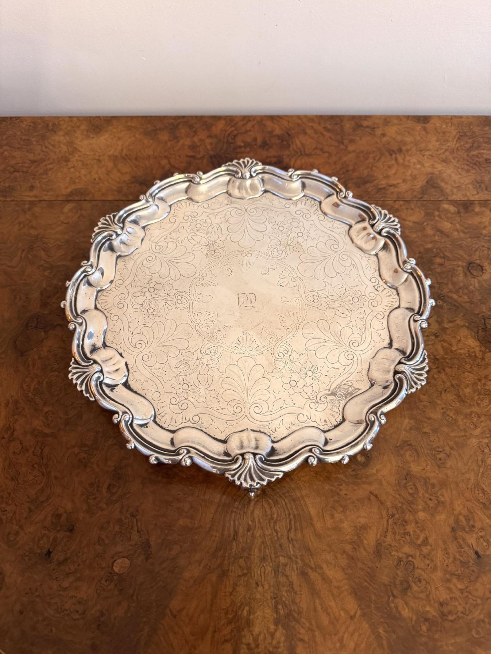 Quality antique Victorian silver plated tray, having a quality engraved tray with an ornate boarder raised on three shaped feet.