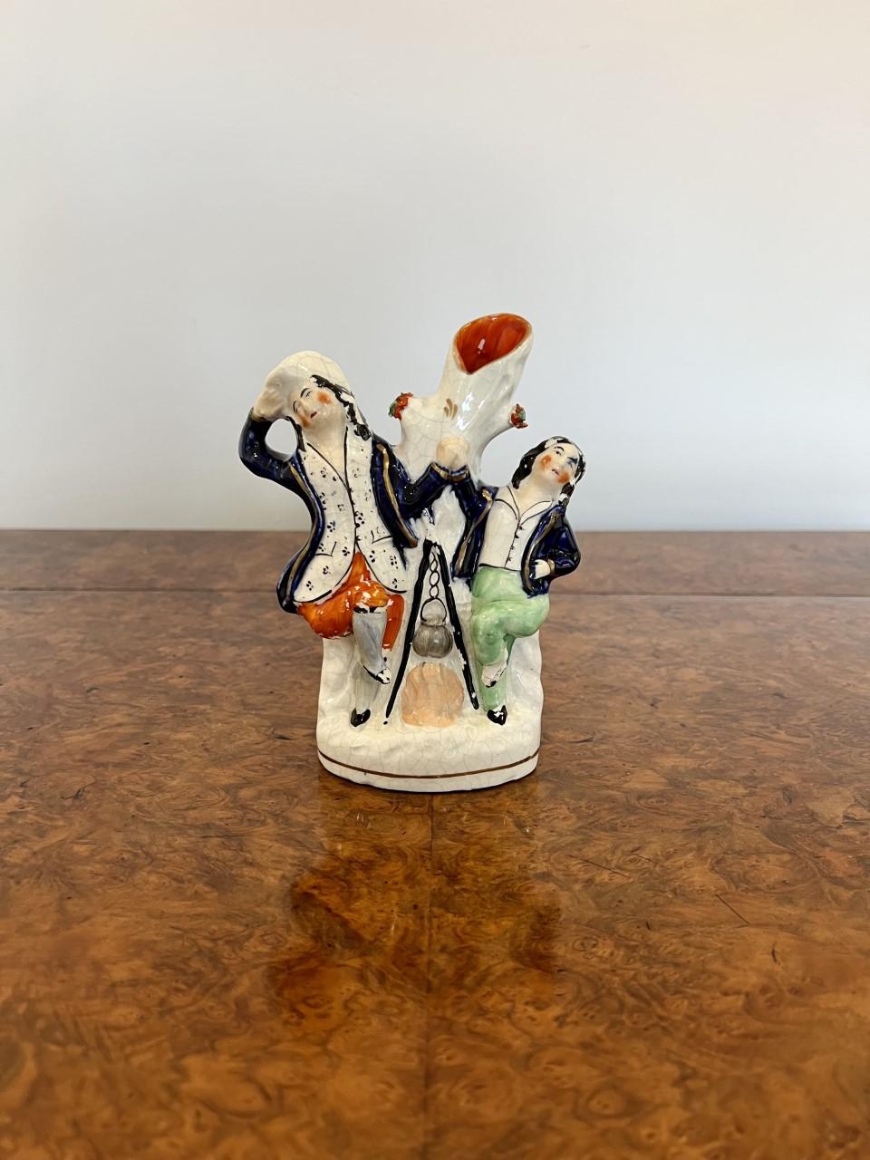 Quality antique Victorian Staffordshire figure having to males in period clothing hand painted in wonderful green, blue, orange and white colours standing on a oval base.