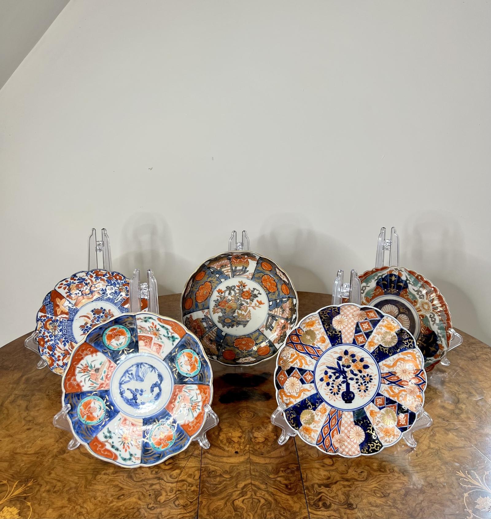 Quality collection of five antique Japanese Imari plates all with lovely individual patterns decorated with flowers, trees, leaves, birds, fish and scrolls hand painted in wonderful red, blue, green, gold and white colours.