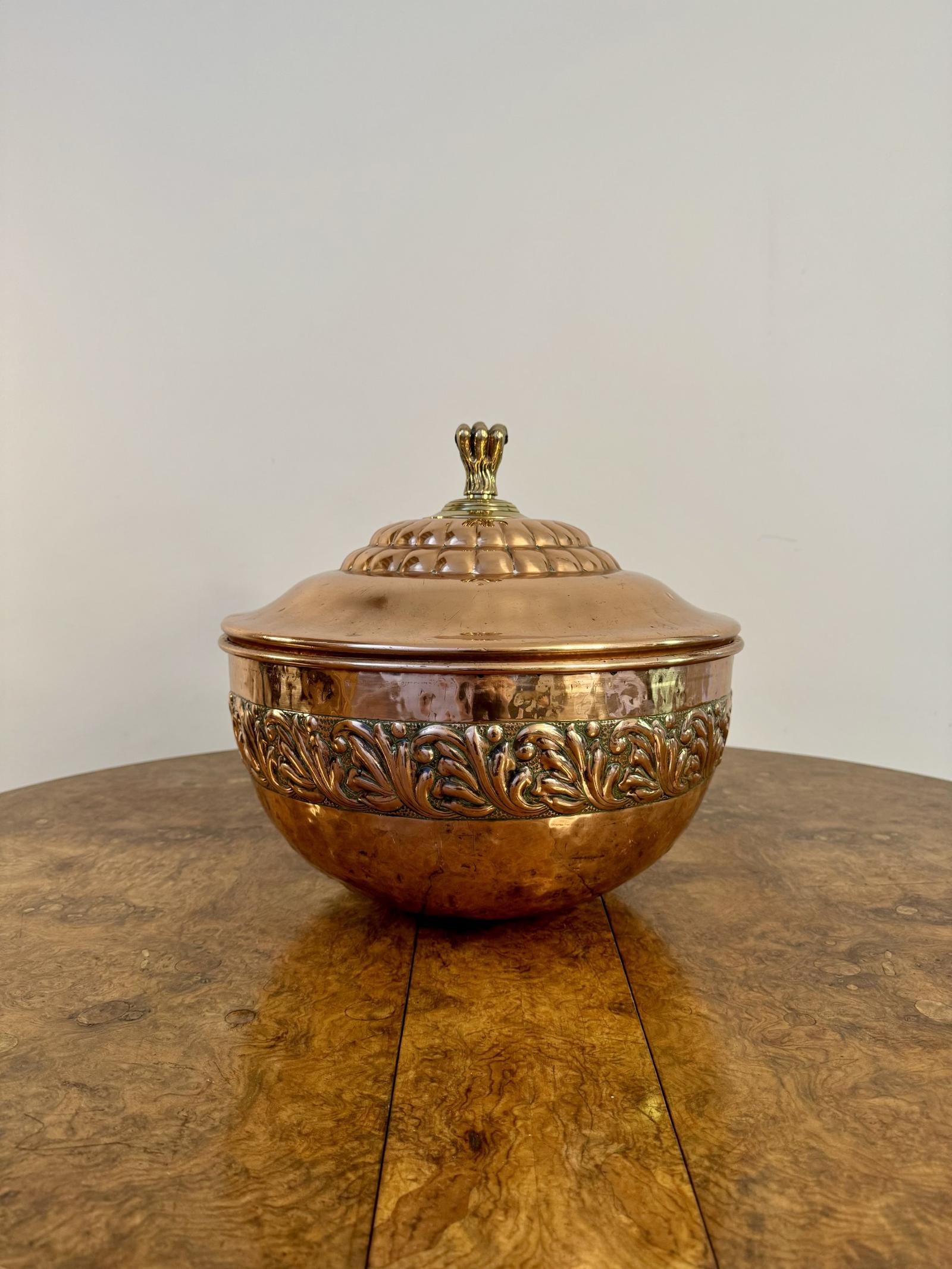 Quality large antique Victorian copper lidded bowl, having a large copper lidded bowl with embossed decoration trailing through the centre with leaves and scrolls, having a lift off copper embossed lid with a brass claw finale to the top.