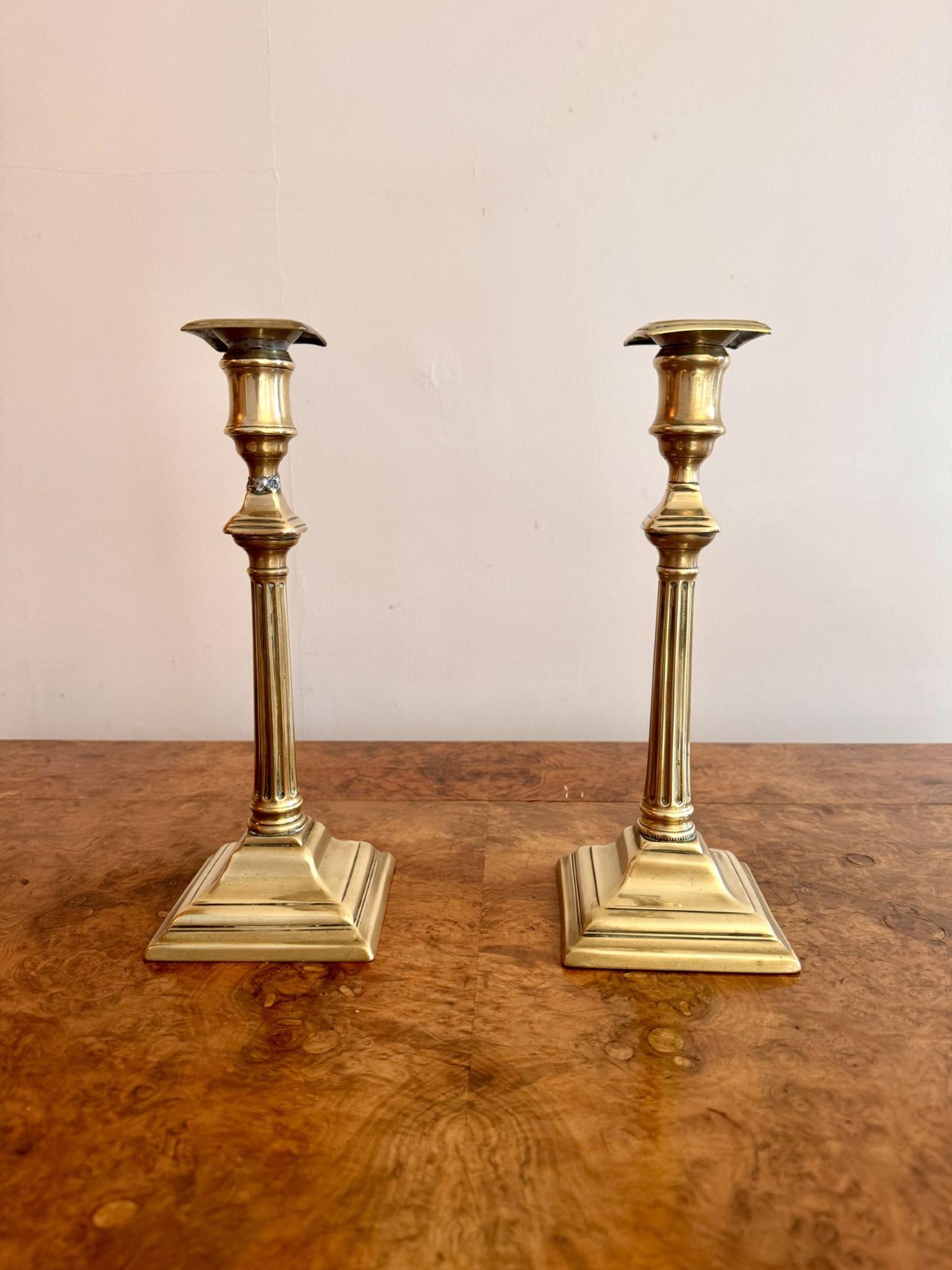 Quality pair of antique Regency brass candlesticks, with square drip trays above a slender stem raised on a stepped base.