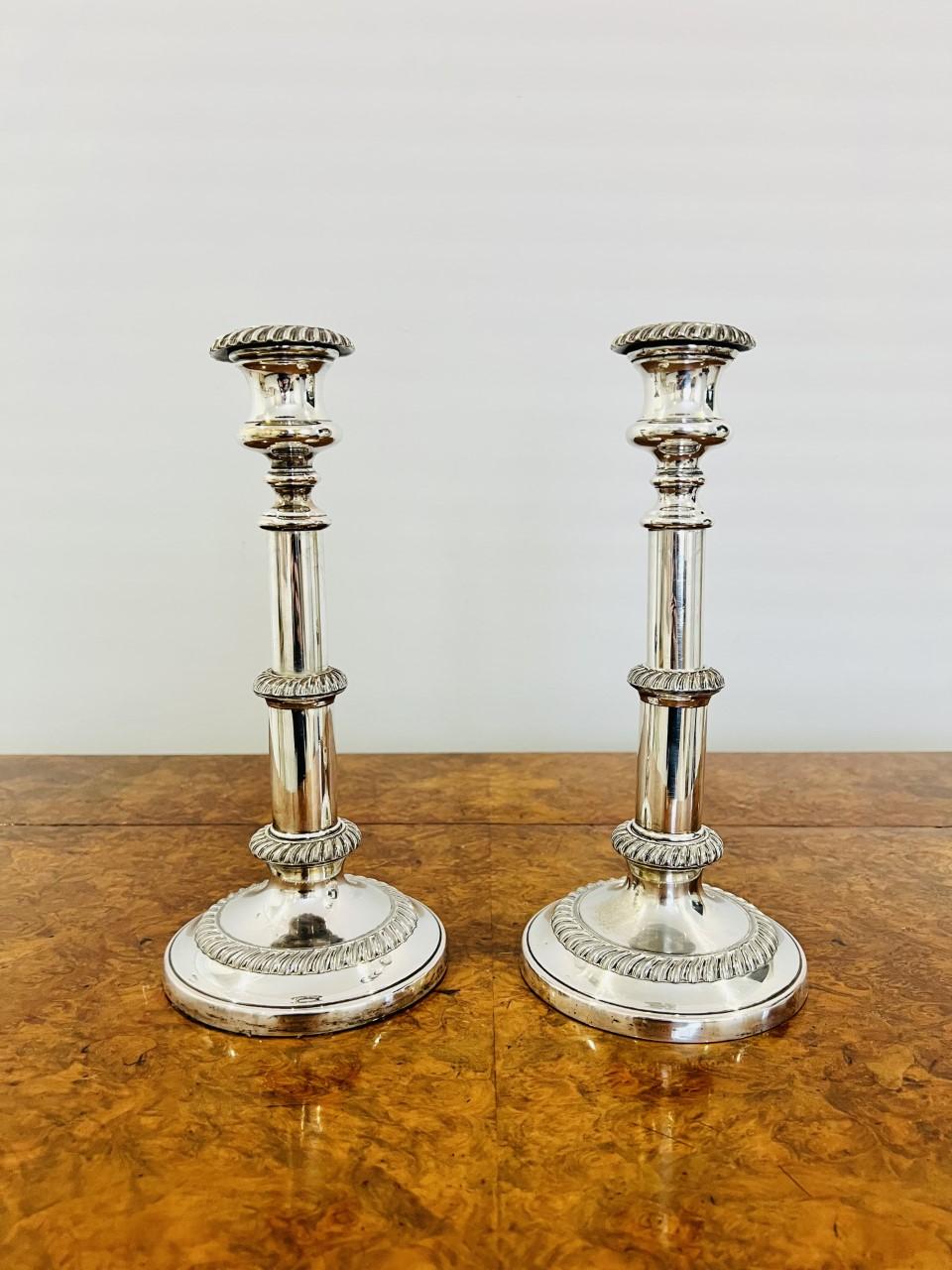 Quality pair of antique Regency telescopic Sheffield plated candlesticks having an ornate turned column on a circular stepped base.