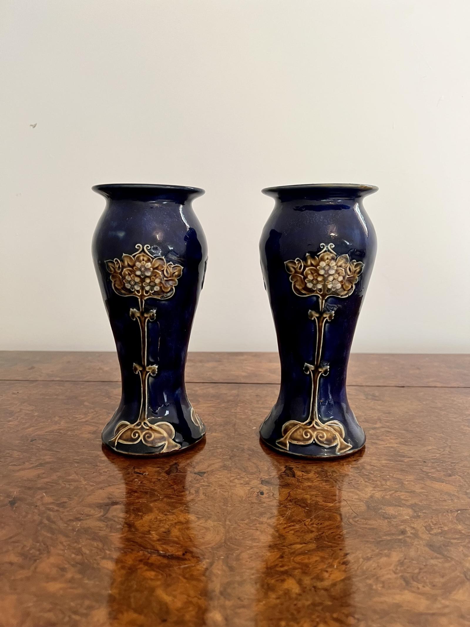 Offered for sale is this quality pair of antique Royal Doulton Art Nouveau vases, having a shaped body with a blue ground decorated with brown flowers stemming from the bottom of the vase with circular green rims to the tops.