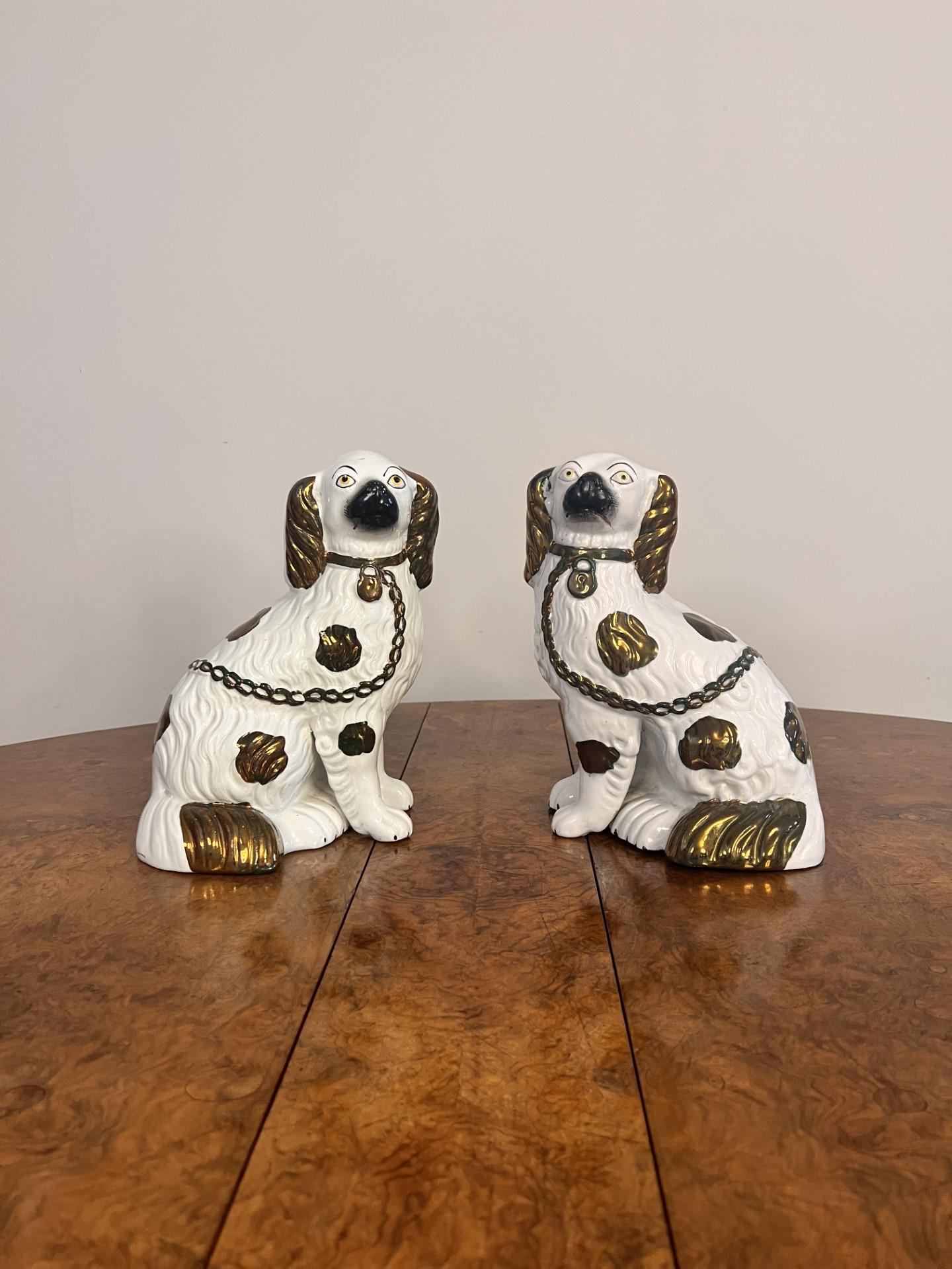 Quality pair of antique Victorian Staffordshire dogs, both seated spaniels with their front legs out, in matching copper brown & white coats, collars, padlocks and chains.