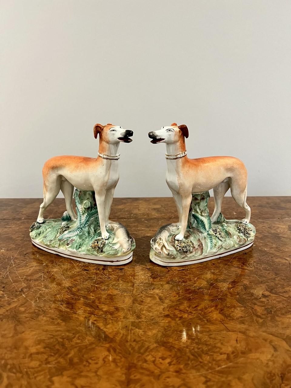 Quality pair of antique Victorian Staffordshire greyhound dogs having a pair of greyhounds standing on a oval shaped base with a rabbit near their front paws hand painted in wonderful brown, green, white and gold colours