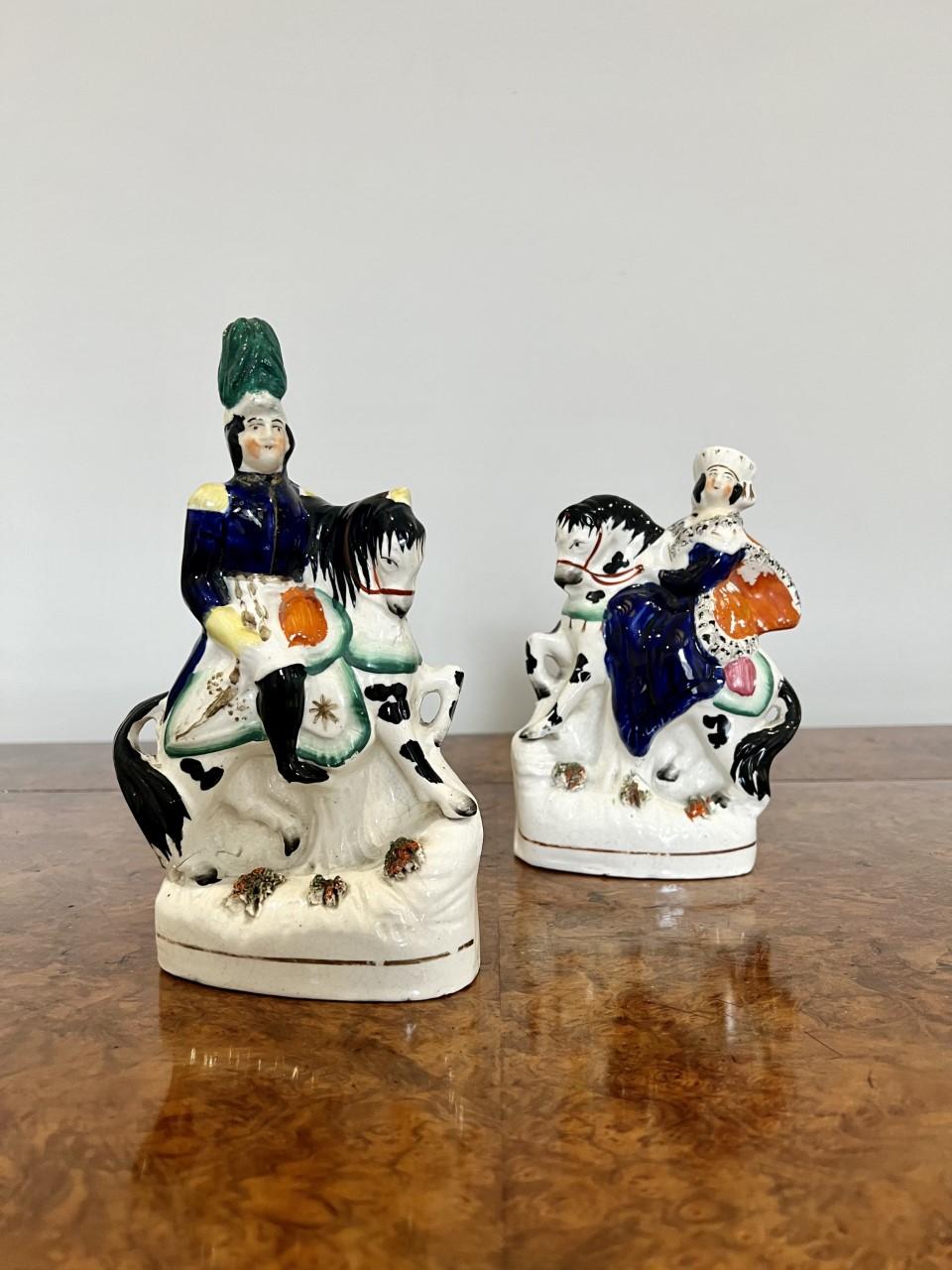 Quality pair of antique Victorian Staffordshire Royal figures having a quality pair of antique Victorian Staffordshire Royal figures of Prince Albert and Queen Victoria on horse back in wonderful blue, green, yellow, white, black and orange colours standing on oval bases.