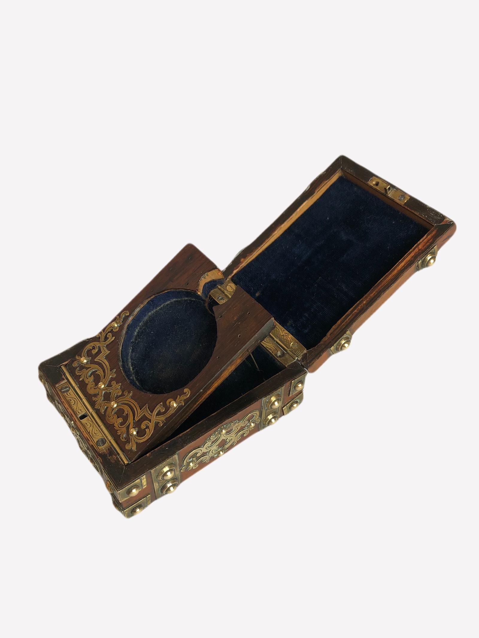 Quality small antique Victorian oak & brass box, having a quality shaped top with engraved brass mounts opening to reveal a compartment for a watch