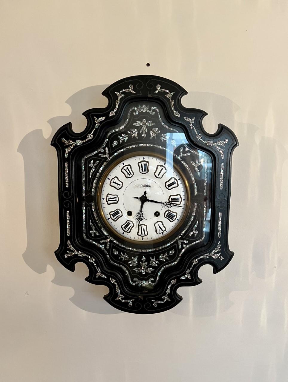Stunning antique 19th century inlaid French wall clock in an attractive inlaid mother of pearl shaped case, having a fantastic inlaid decorated ornate circular porcelain dial with the original hands, eight day movement striking the hour and half hour on a gong.