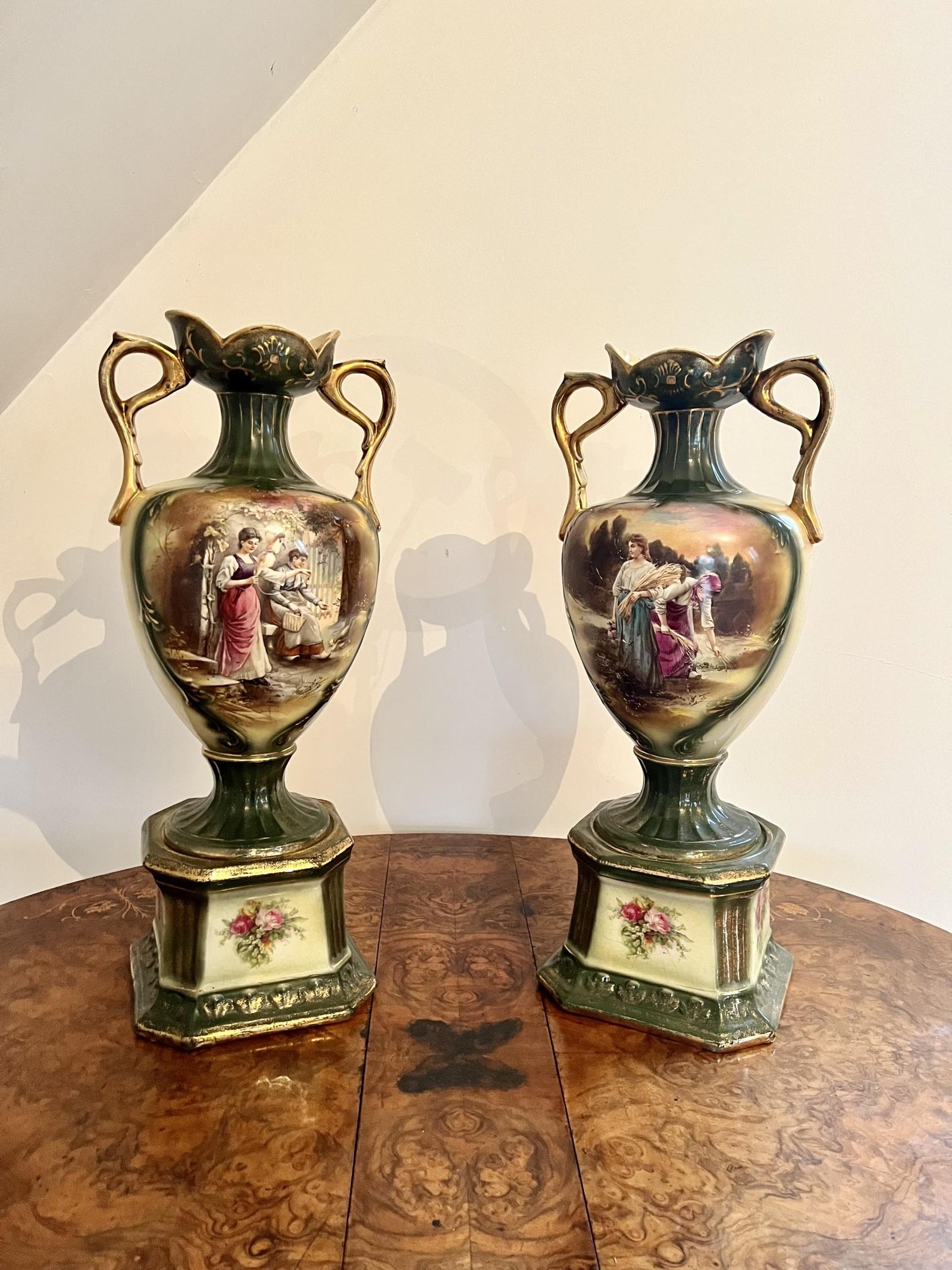 Stunning pair of large antique Victorian vases, with a green ground decorated with beautiful flowers on one side and a figural scene to the other side, hand painted in stunning pink, yellow, green, red and brown colours, having twin gilt handles to both sides raised on square shaped bases.