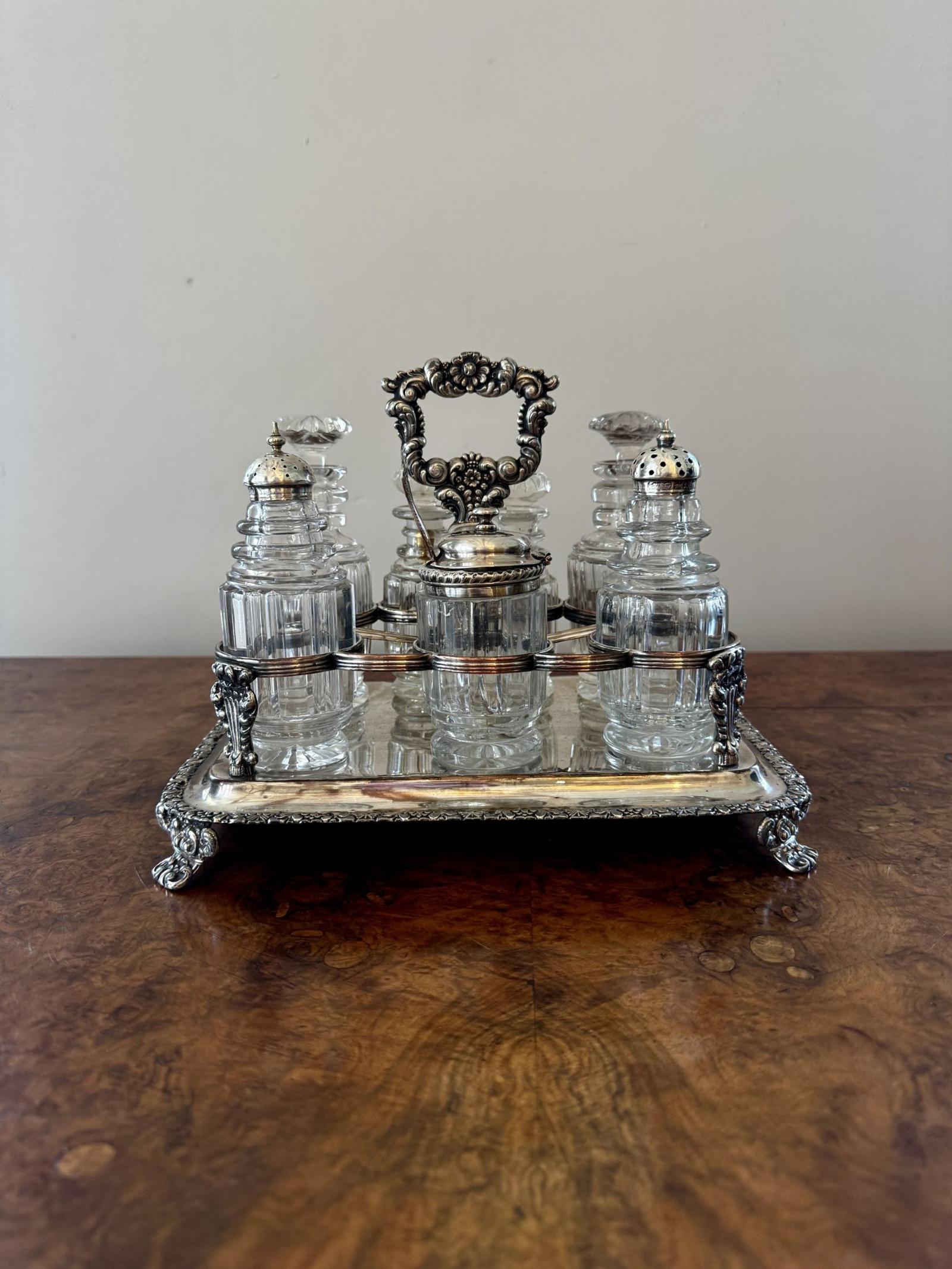 Wonderful quality antique Georgian seven bottle cruet set, having a quality antique Georgian cruet set, with a silver plated ornate stand with a shaped carrying handle to the centre above seven holders, raised on four shaped feet,