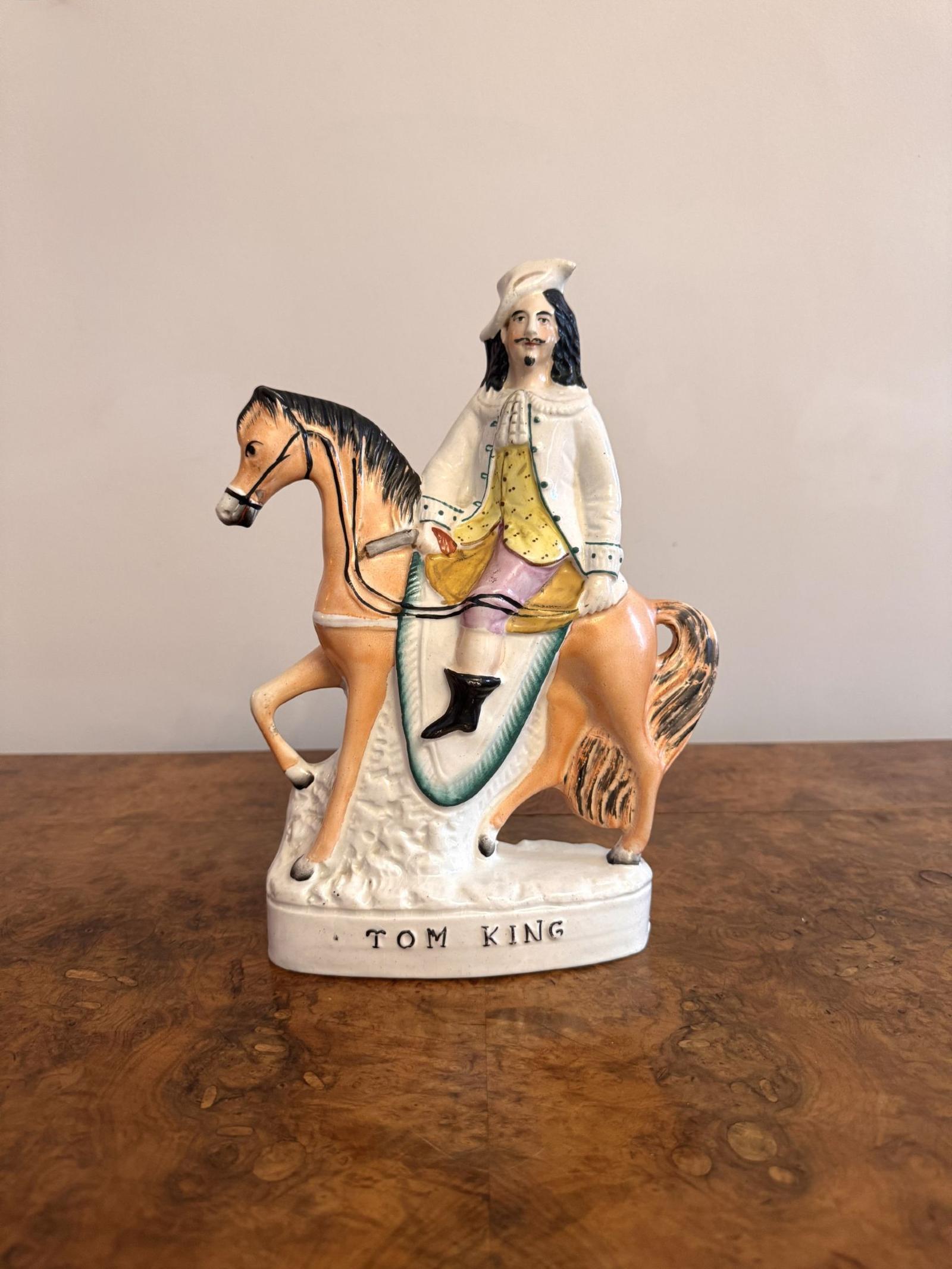 Wonderful quality antique Victorian Staffordshire figure, having a quality antique Staffordshire figure of a man on horseback wearing traditional clothing, hand painted in stunning white, green, yellow, pink and brown colours, mounted above foliage on an oval shaped base inscribed 'Tom King'.